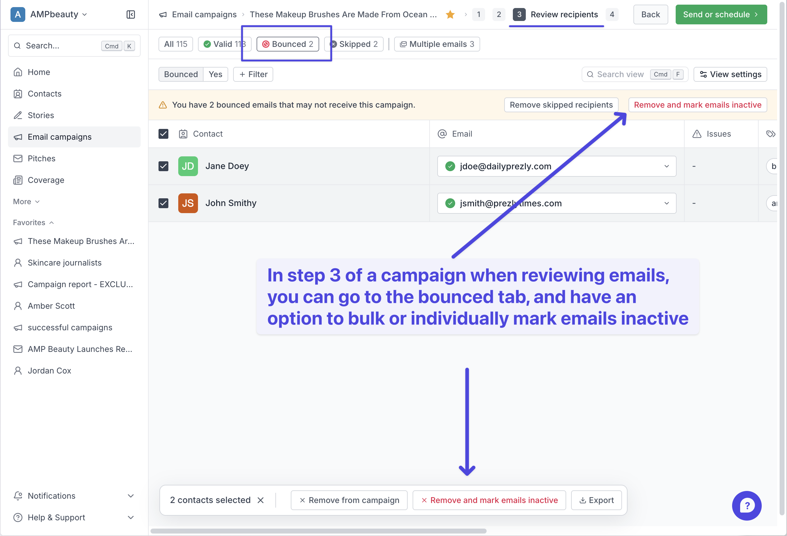 To protect your email reputation, when writing pitches or email campaigns, contact emails marked inactive will now be skipped and cannot be sent to.