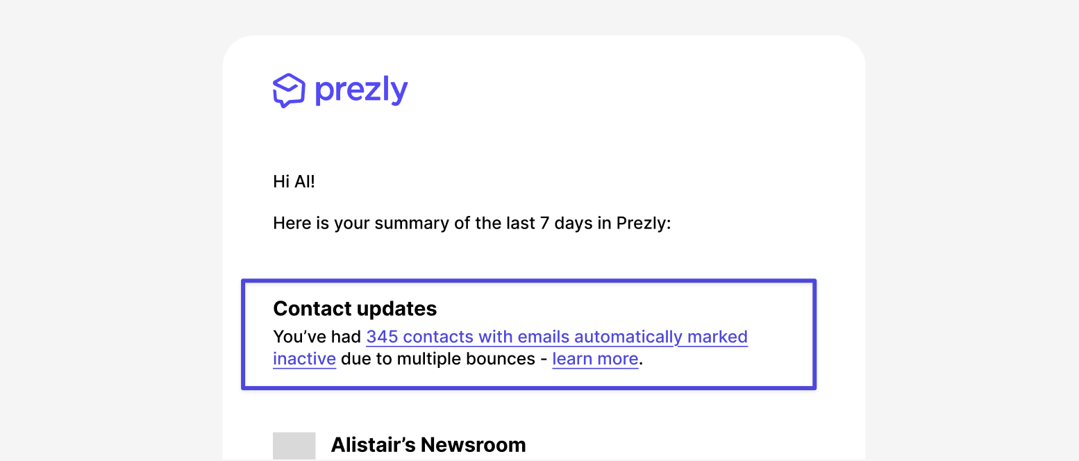 - auto-mark active on successful send - if you have contact email addresses marked as bounced, and email is successfully delivered through the prezly network to that matching email address, we automatically mark your contact email as healthy and ready to receive emails again.
