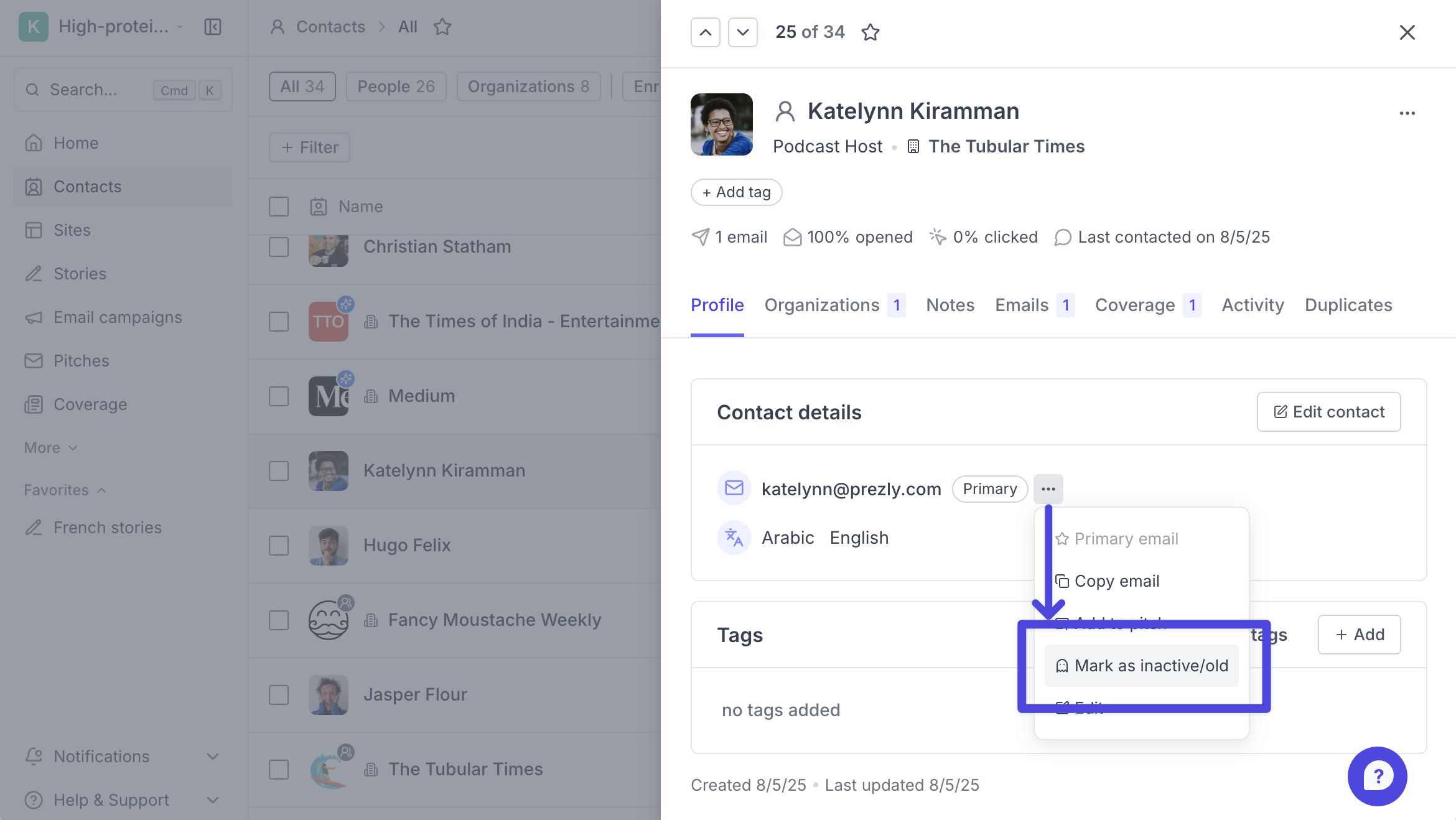 Not every email address is one you want to send to – old job addresses, personal emails, or anything that's bounced. The new inactive status lets you keep an address on file without it causing problems in your outreach.