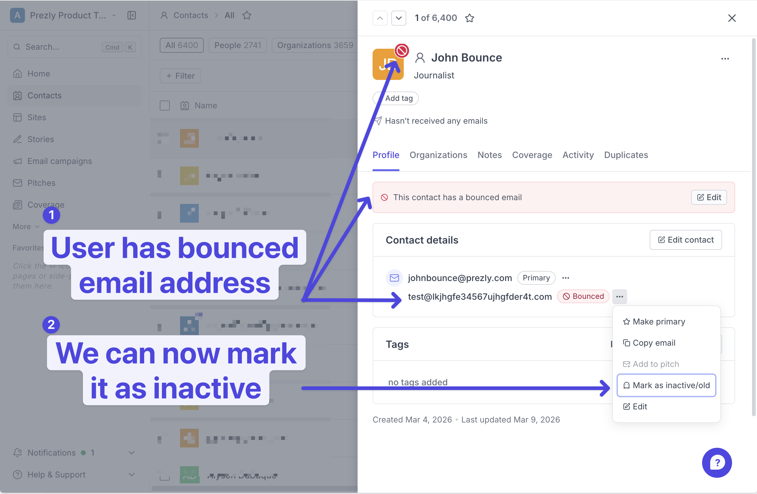 Contact email addresses get used in many ways — like keeping track of somewhere someone used to work after they change roles. But old emails often bounce when someone leaves an organization (or for other reasons), and bounced emails can cause problems when sending pitches and campaigns where you want to ensure you're only sending to valid addresses.