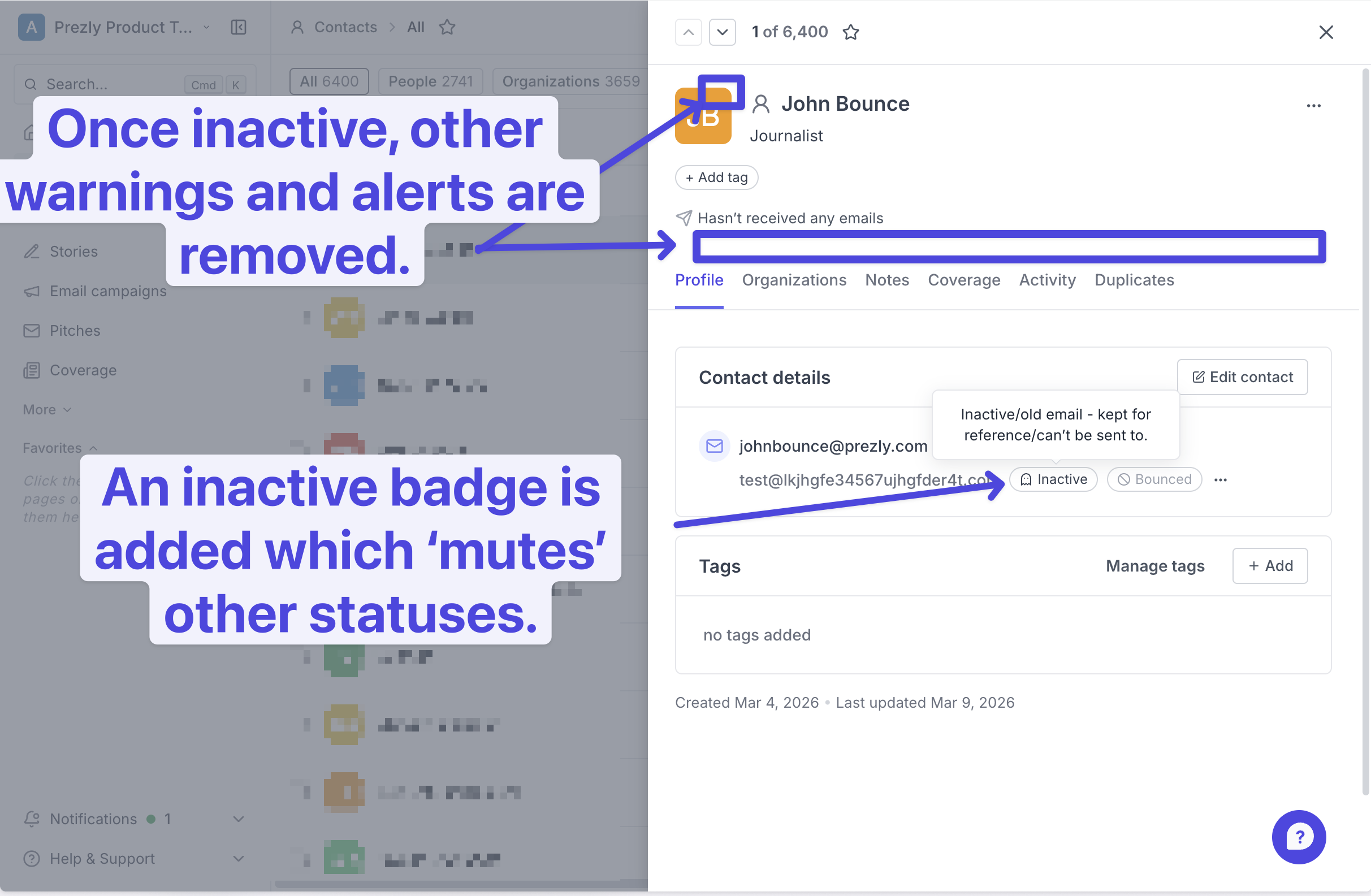 Emails marked as inactive can't be selected in pitch composers and are automatically skipped in email campaigns — so no more accidentally sending to the wrong address. This also quiets down bounce alerts across grids, asides, and edit forms.