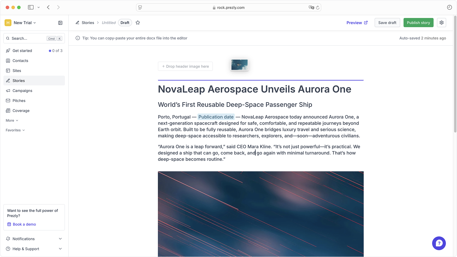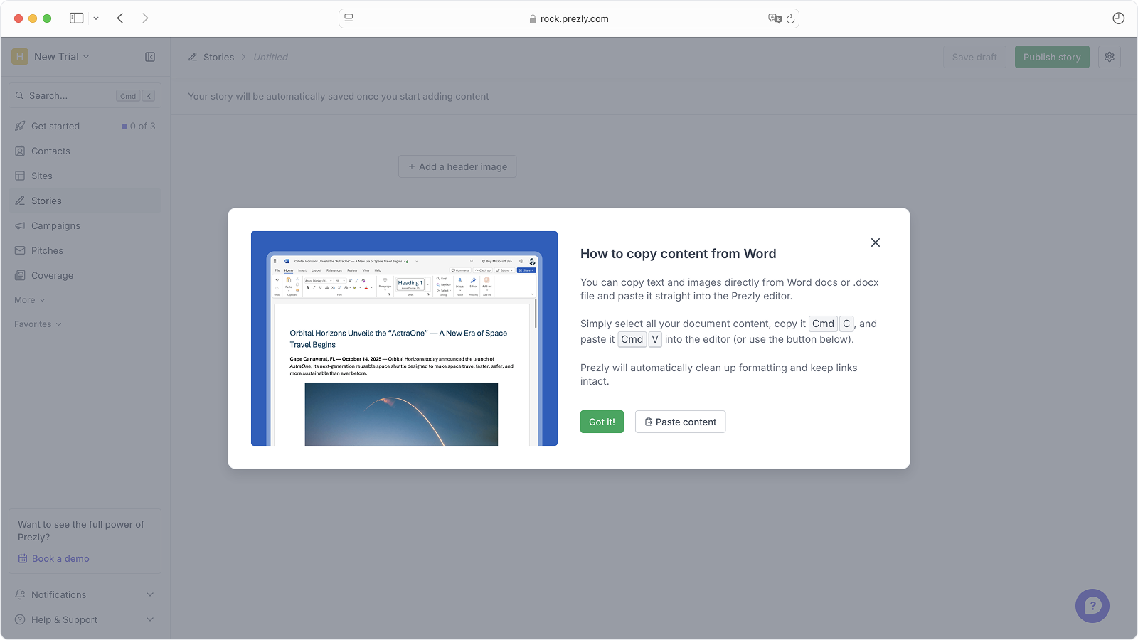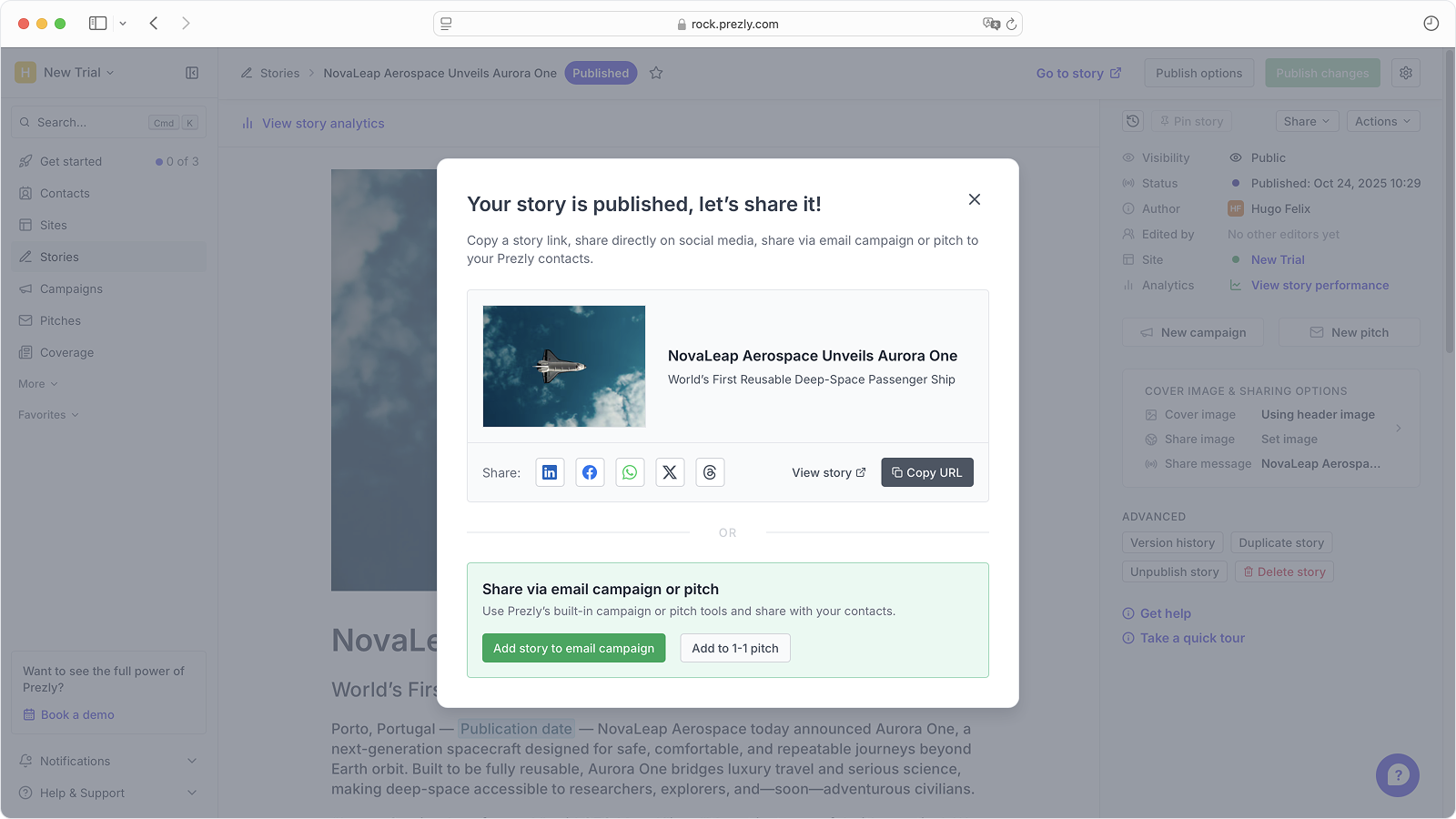 - New “Share with Prezly” section to add the story to a campaign or a pitch