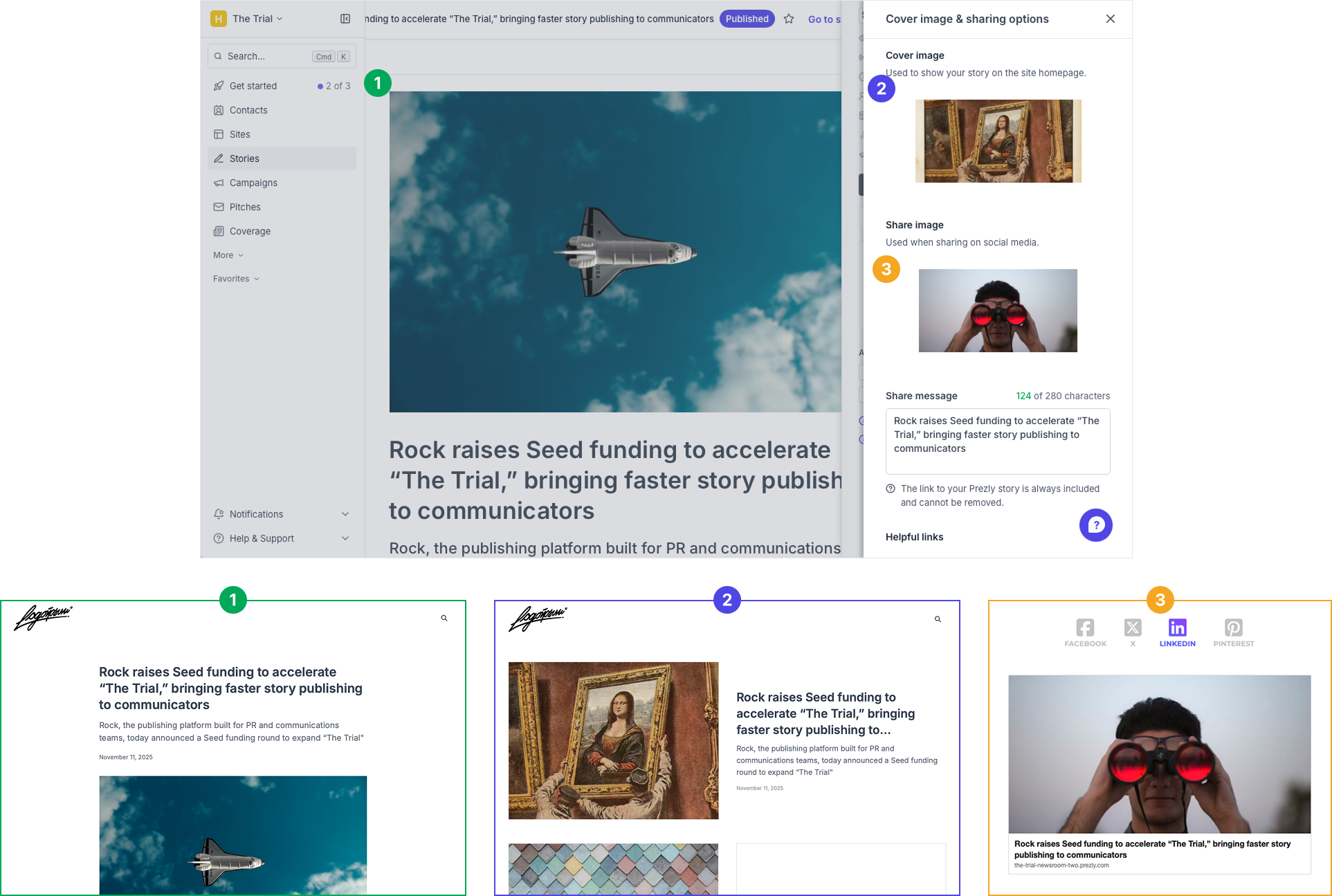 The social sharing image is used for previews outside of Prezly (for example, when sharing on social media).