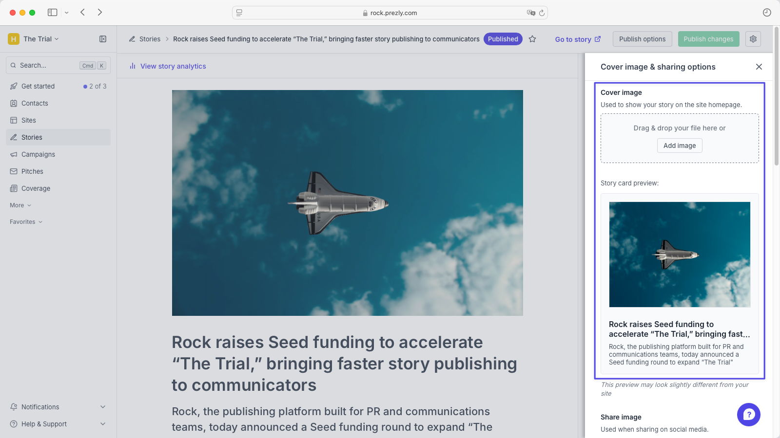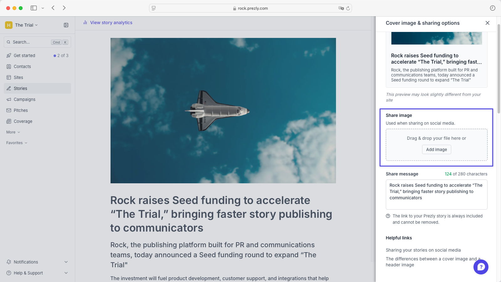 By default, the social image uses your story’s header image. To set a specific social image, go to the Cover image & sharing options section, click Add image, or drop an image into the placeholder.